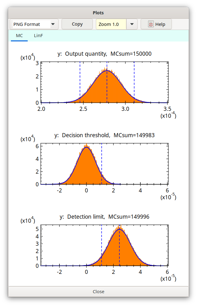 The distributions which are produced according to the three methods discussed above are displayed as histograms in a separate window while the simulation is running. They show each distribution accumulated from the r runs which stabilize after only few (of r) repetitions. In the case of the Detection limit the accumulated distribution is displayed after the r runs are terminated. The x-axis (abscissa) corresponds to values of the evaluated quantity shown in the title of a plot; the y-axis (ordinate) shows the probability.