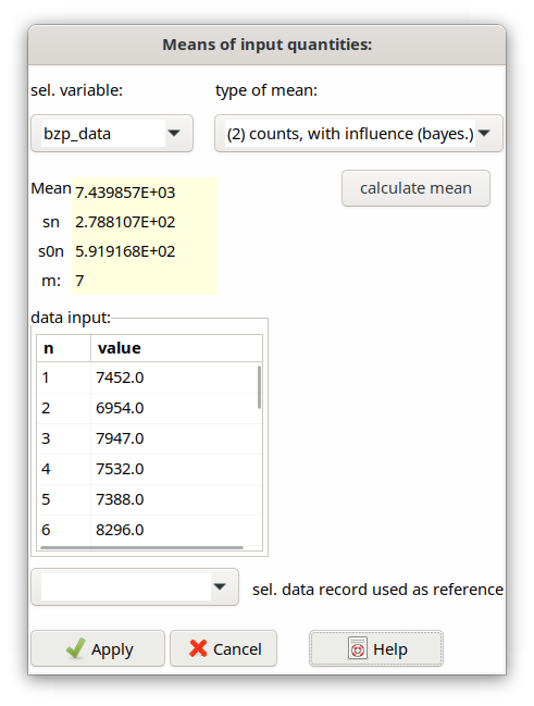 For organizing the data input it is recommended to begin with data input into the TAB “Values, Uncertainties”. For mean variables characterized by „m“ as type the „t distribution“ is to be selected as distribution type which enables a correct statistical treatment of the mean within the mean dialog. Then, the mean dialog can be opened in which the desired mean variable is selected; after input of associated singe values the type of mean is selected which then can be calculated. After leaving the dialog the calculation of uncertainties needs to be updated/repeated.
